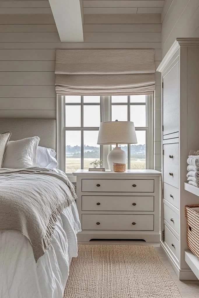 This small cabin interior bedroom maximizes space and light with high ceilings and large windows. The use of light colors and minimalistic furniture helps to keep the space feeling open and airy. Subtle nautical accents hint at a coastal theme, blending seamlessly with the cabin’s natural surroundings. This bedroom is perfect for those who appreciate a bright, fresh approach to cabin design, making it feel expansive and welcoming.