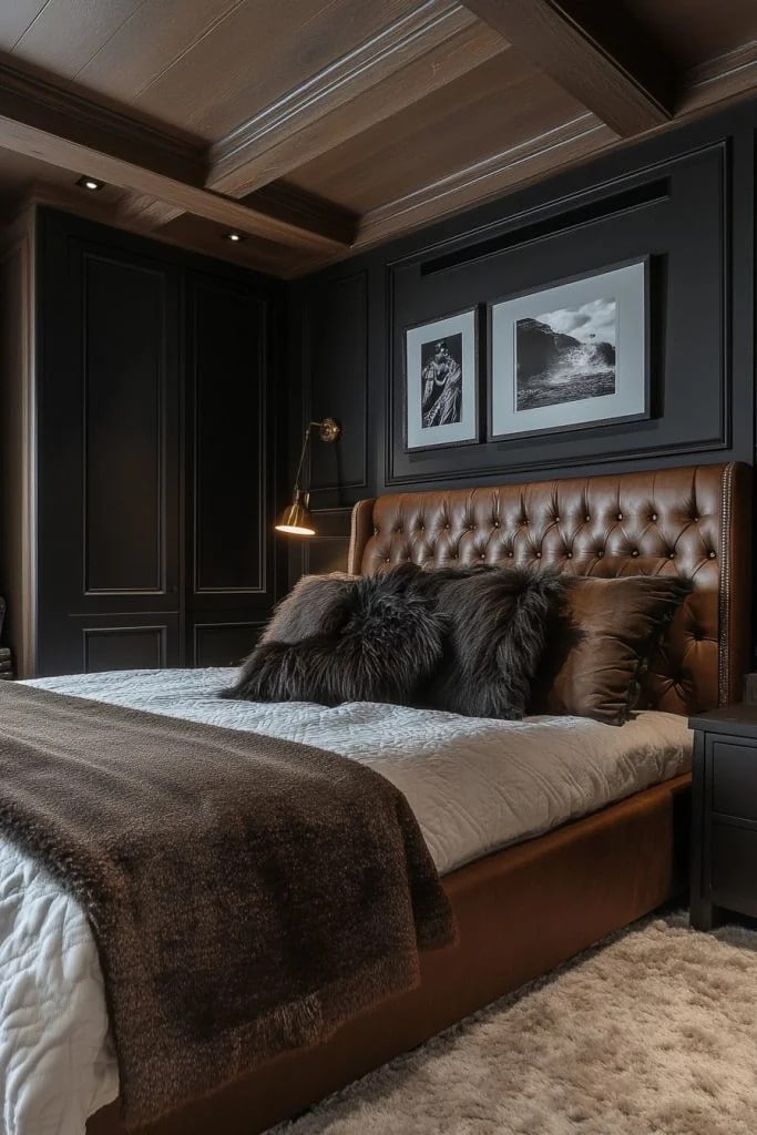 Dark tones and rich textures dominate this small cabin interior bedroom, making it a cozy woodland escape. Plush carpets, heavy drapes, and soft lighting create a snug atmosphere that invites relaxation and comfort. The use of dark colors enhances the intimate feel of the space, making it perfect for unwinding after a day outdoors. This bedroom design is ideal for those who love a more enveloping, cozy cabin experience.