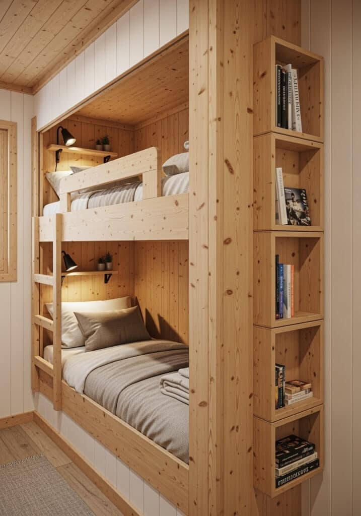 For the ultimate space-saving and cozy solution in a small cabin bedroom, integrate a built-in bunk nook. This design involves custom-building a bunk bed structure directly into an alcove or against a wall. The lower bunk can be a comfortable single bed, while the upper bunk provides an additional sleeping space or a cozy reading perch. Integrate shelves, drawers, and even a small reading light into the wooden structure. This creates a highly functional, space-efficient, and incredibly charming sleeping area that feels like a private, custom-made hideaway.