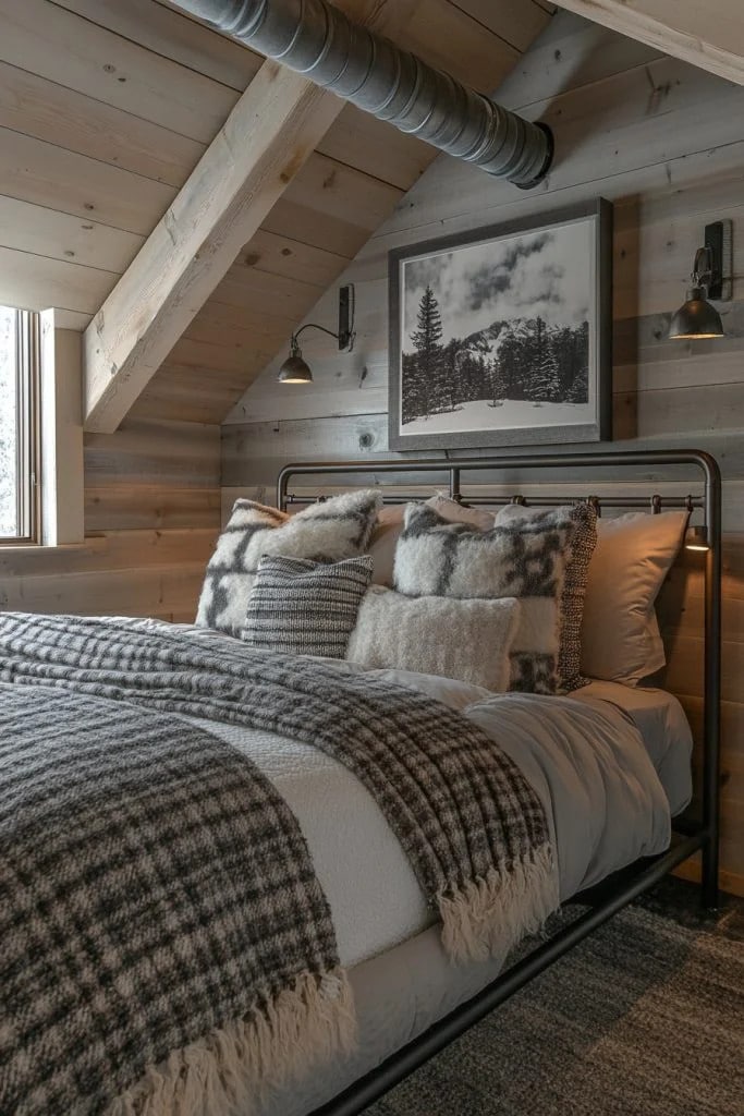 This small cabin interior bedroom combines industrial chic with cabin coziness, featuring exposed metal fixtures, raw wood, and a monochromatic color scheme. High ceilings and minimal wall decor open up the space, while soft textiles like faux fur rugs and knitted throws add warmth and comfort. This style suits those who appreciate a more edgy, contemporary look in their cabin retreat. Industrial elements are balanced with cozy features to create a unique and inviting space.