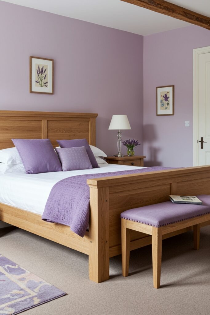Create a space that feels both grounded and ethereal by pairing soft lavender with the warmth of natural wood. Imagine pale lavender walls serving as a gentle backdrop for a solid oak bed frame or rustic pine nightstands. This combination balances the cool, dreamy quality of lavender with the earthy, organic feel of wood, resulting in a room that is both serene and connected to nature. It’s a perfect choice for a modern farmhouse or a cozy cottage aesthetic, offering a unique blend of softness and strength for a truly calming retreat.
