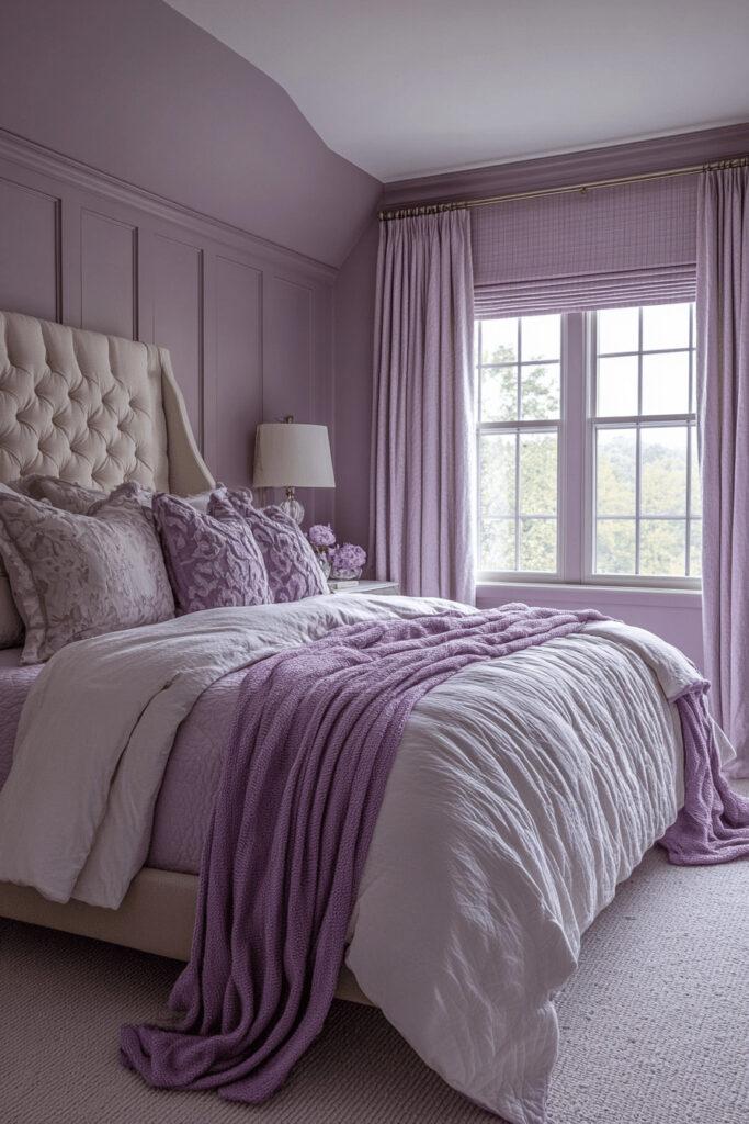 Design a bedroom with the primary goal of promoting deep, restful sleep. This idea uses slightly deeper shades of lavender, which are known for their powerful calming properties that help soothe the mind. The focus is entirely on comfort. Choose a high quality mattress and pillows, and dress the bed in soft, breathable fabrics like cotton or bamboo. Keep technology and other distractions to a minimum. This bedroom is a visual lullaby, creating a tranquil and soothing ambiance that signals to your body and mind that it’s time to rest.