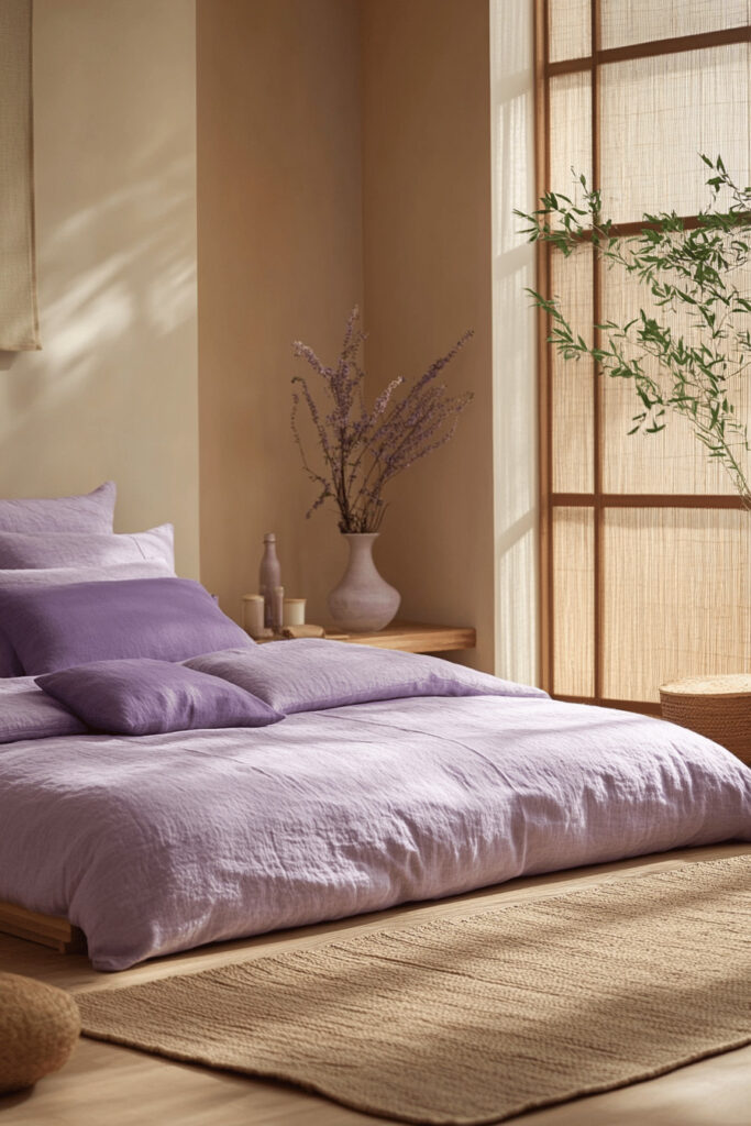 Incorporate principles of Zen design to create a bedroom that promotes mindfulness and deep relaxation. A soft lavender hue provides a calming visual base. The decor is minimalistic and inspired by nature, featuring elements like bamboo, smooth stones, and simple, clean lines. The space is kept orderly and free of clutter to encourage a sense of inner calm. This bedroom is an ideal environment for those who practice meditation or yoga, transforming their living space into a sanctuary for peace and reflection.