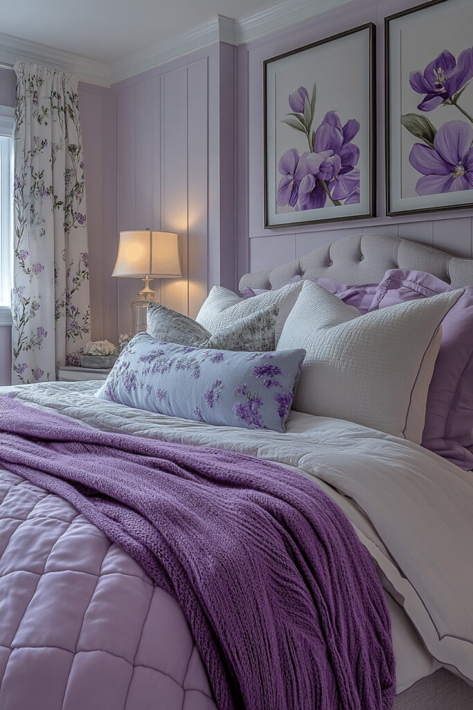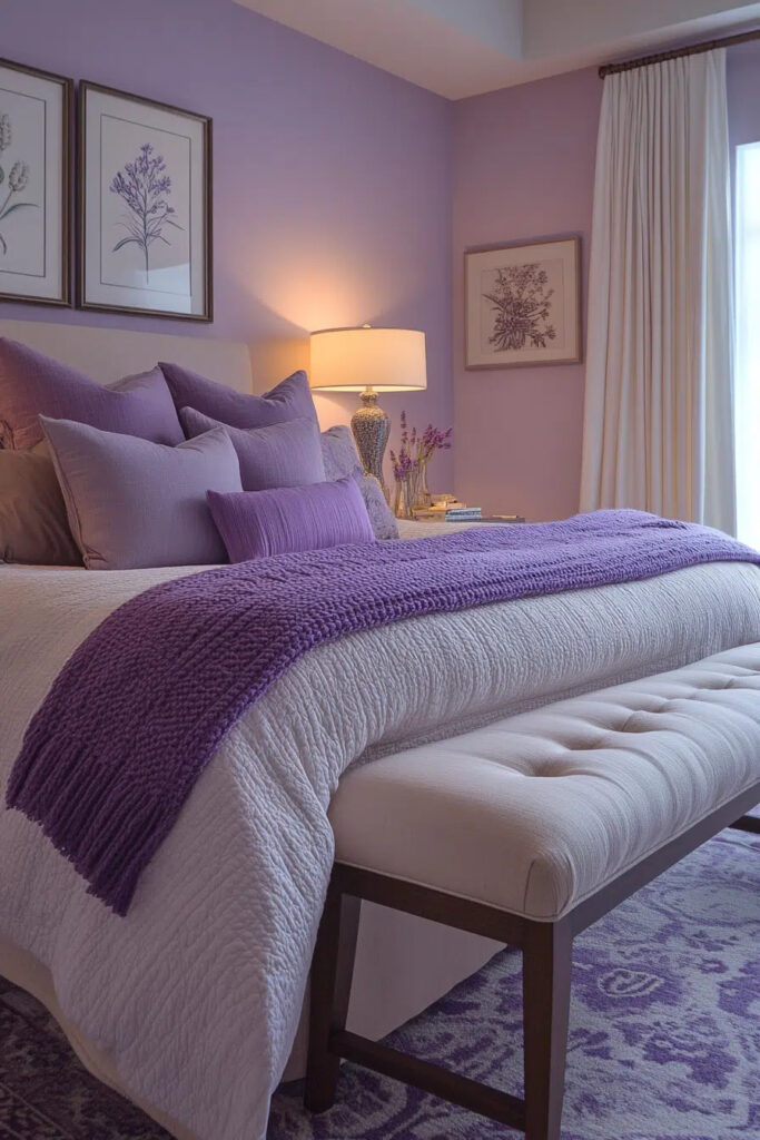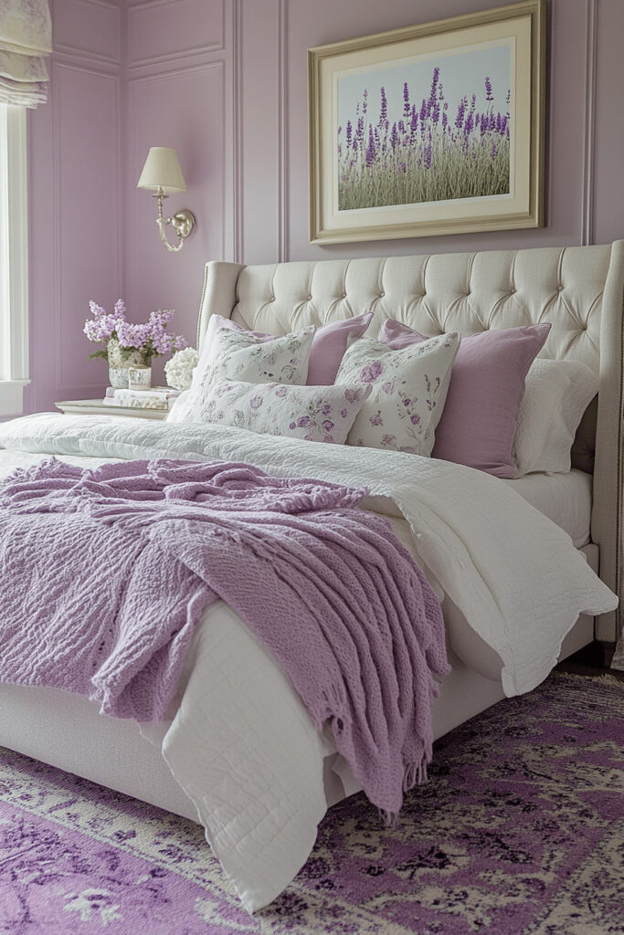 Create the ultimate space for relaxation with a gentle approach to a lavender theme. This design uses the palest, most delicate shades of lavender and pairs them with exceptionally soft textures. The focus is on creating a calm and peaceful atmosphere above all else. Think of cozy, oversized knits, plush rugs that you can sink your feet into, and soft, diffused lighting. This bedroom is a gentle escape from the stresses of daily life, offering a comforting and rejuvenating space for rest.