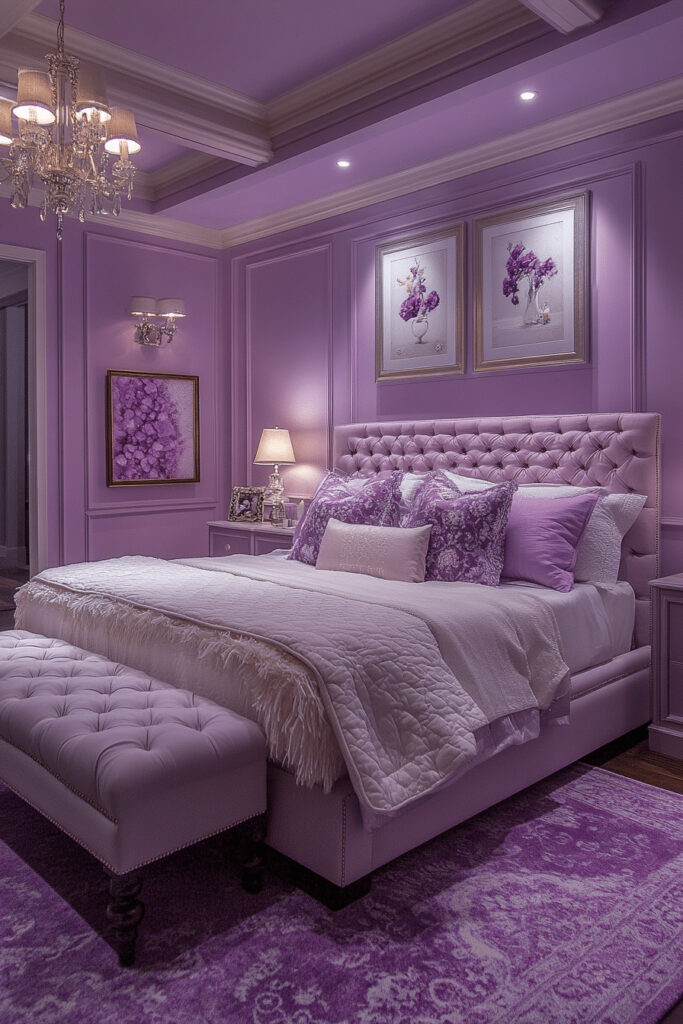Craft a personal haven of indulgence by designing a luxurious lavender suite. This style is all about rich textures and elegant details. Picture plush, lavender colored velvet curtains, a deeply tufted headboard, and silky, high thread count sheets. Classic furnishings in cream or polished silver complete the look, enhancing the feeling of opulence. This approach uses the calming nature of lavender as a sophisticated base for a room that feels both incredibly comfortable and wonderfully high end, making every day feel like a stay in a five star hotel.