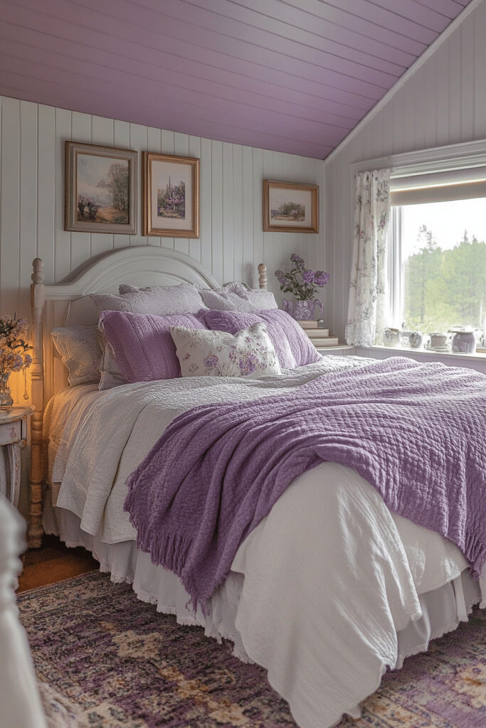 Create a bedroom that is brimming with charm and personality. This design uses a soft lavender color scheme as a base for quaint, homey touches that make the room feel incredibly warm and welcoming. Incorporate vintage furniture, handmade quilts, and personal collections of photos or keepsakes. The goal is to create a comfortable space that feels like a true reflection of you. The lavender enhances the room’s inviting and friendly nature, making it a delightful and characterful place to unwind at the end of the day.