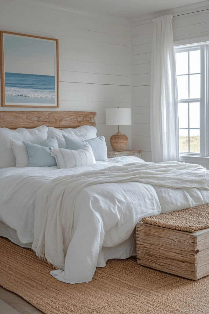 The Beachfront Bliss Bedroom captures shore-side joy, its sandy beige walls paired with a driftwood bed draped in sky blue linens, accented by wave-patterned throws. Large windows flood the space with light, while a jute rug softens the floor, grounding the beachy vibe. A single coastal landscape adds serene art, fostering relaxation, and sheer linen curtains enhance the airy glow. A rattan chandelier glows warmly, deepening the shore-like feel. This bedroom suits those who live for the beach, offering a tropical retreat where bliss thrives in cozy comfort.