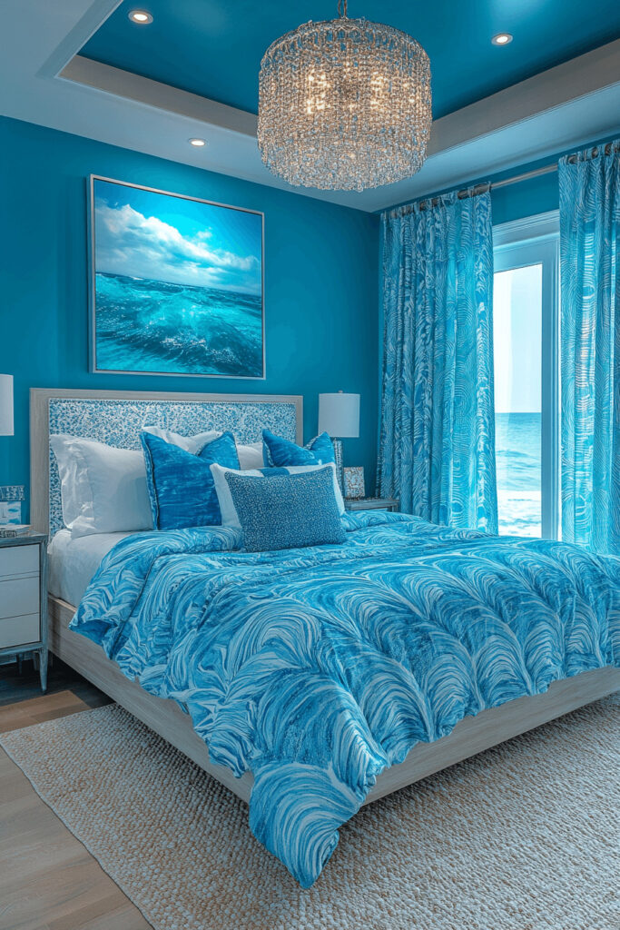 The Wavecrest Wonder Room pulses with oceanic energy, its deep aqua walls paired with a light pine bed draped in blue linens, accented by wave-patterned throws. Glass accents reflect light, while a wool rug softens the floor, grounding the dynamic vibe. A single ocean print adds bold art, fostering majesty, and sheer linen curtains filter light, amplifying the watery glow. A brass chandelier glows softly, enhancing the wave-like feel. This room suits those who love sea power, offering a tropical bedroom where waves inspire cozy awe.