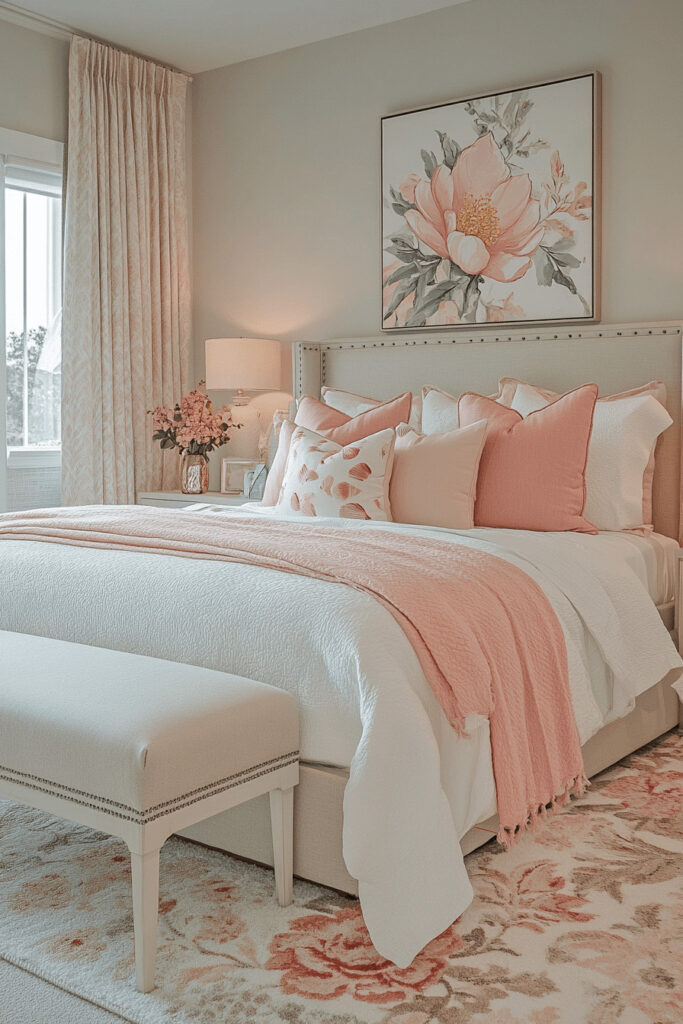 The Seashell Soft Room radiates delicate charm, its pale pink walls paired with a light pine bed draped in beige linens, accented by seashell-patterned cushions. Smooth textures in bedding add tactile calm, while a silk rug softens the floor, grounding the feminine vibe. A single shell sculpture fosters serenity, and sheer linen curtains filter light, amplifying the soft glow. A rattan lamp glows gently, enhancing the subtle feel. This room suits those who love gentle shores, offering a tropical bedroom where seashells create a cozy retreat.