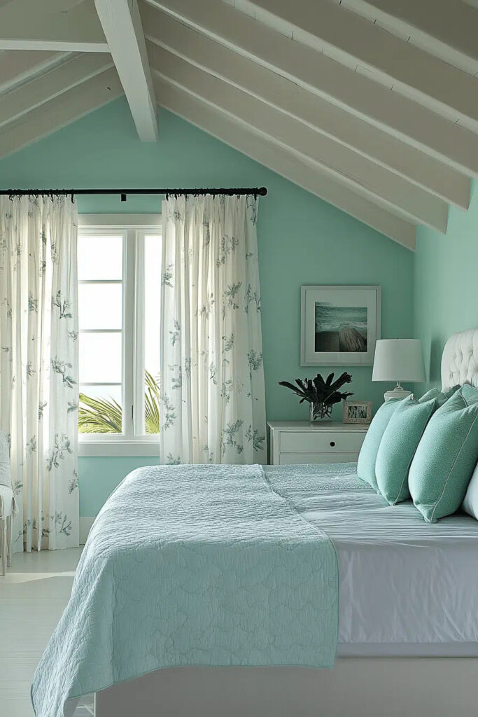 The Serene Seafoam Sanctuary soothes with gentle elegance, its seafoam green walls paired with a light wood bed draped in white linens, accented by creamy throws. Simple wooden furniture keeps it airy, while a wool rug softens the floor, grounding the serene vibe. A single coastal sketch adds minimal art, fostering tranquility, and sheer linen curtains filter light, amplifying the soft glow. A rattan lamp glows softly, enhancing the peaceful feel. This sanctuary suits those who love calm coastal tones, offering a tropical bedroom where seafoam serenity thrives.