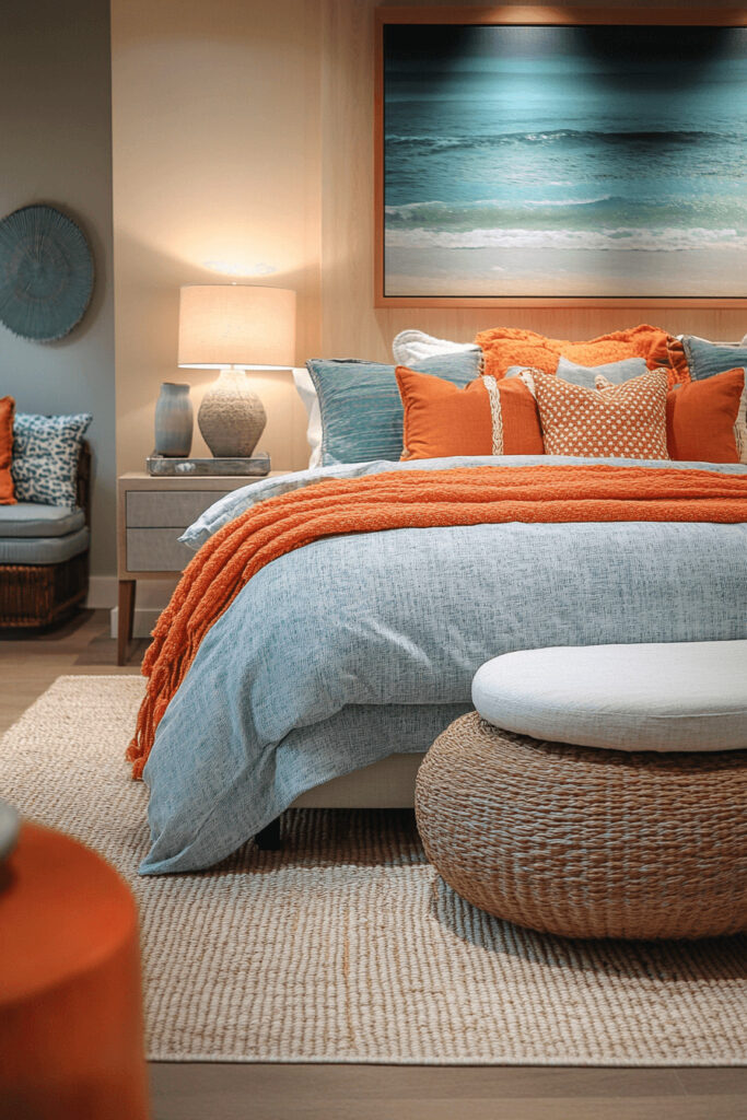 The Sunset Lagoon Loft glows with warm vibrancy, its dusky pink walls paired with a bamboo bed draped in orange linens, accented by grey-blue pillows. Soft lighting mimics sunset hues, while plush throws and a silk rug soften the hardwood floor, grounding the dynamic vibe. A single lagoon watercolor adds serene art, fostering relaxation, and sheer cotton curtains filter light, amplifying the warm glow. A rattan lamp glows softly, enhancing the sunset effect. This loft suits those who love dusk’s beauty, offering a tropical bedroom where lagoon serenity meets cozy warmth.