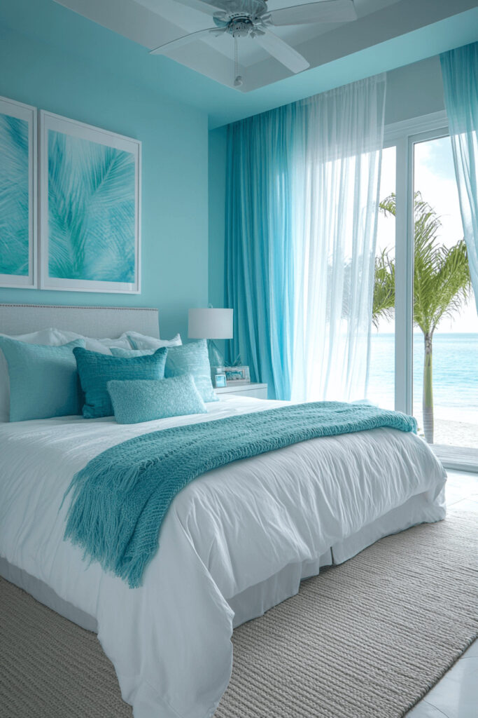 The Tropical Turquoise Room energizes with vibrant calm, its turquoise walls paired with a sleek oak bed draped in creamy linens, accented by grey pillows. Minimal decor—a modern art print or sleek light fixture—keeps it clean, while a jute rug softens the floor, grounding the bold vibe. A single glass sculpture adds subtle art, fostering calm, and sheer cotton curtains filter light, amplifying the tropical glow. A brass chandelier glows warmly, enhancing the upbeat feel. This room suits those who love bold tropical hues, offering a cozy, lively retreat.