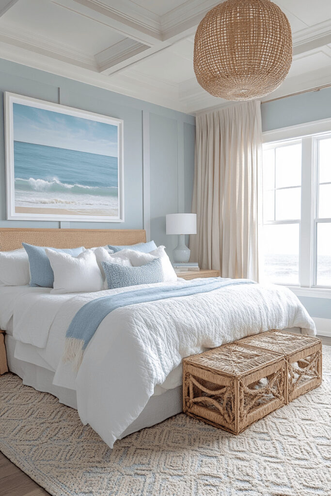 The Coastal Cloud Bedroom radiates airy calm, its muted blue walls paired with a light oak bed draped in soft grey linens, accented by billowing throws. Lightweight fabrics mimic clouds, while a wool rug softens the floor, grounding the ethereal vibe. A single abstract sketch adds minimal art, fostering tranquility, and sheer linen curtains filter light, amplifying the airy glow. A rattan chandelier glows softly, enhancing the serene feel. This bedroom suits those who love coastal skies, offering a tropical retreat where cloud-like serenity creates a cozy haven.