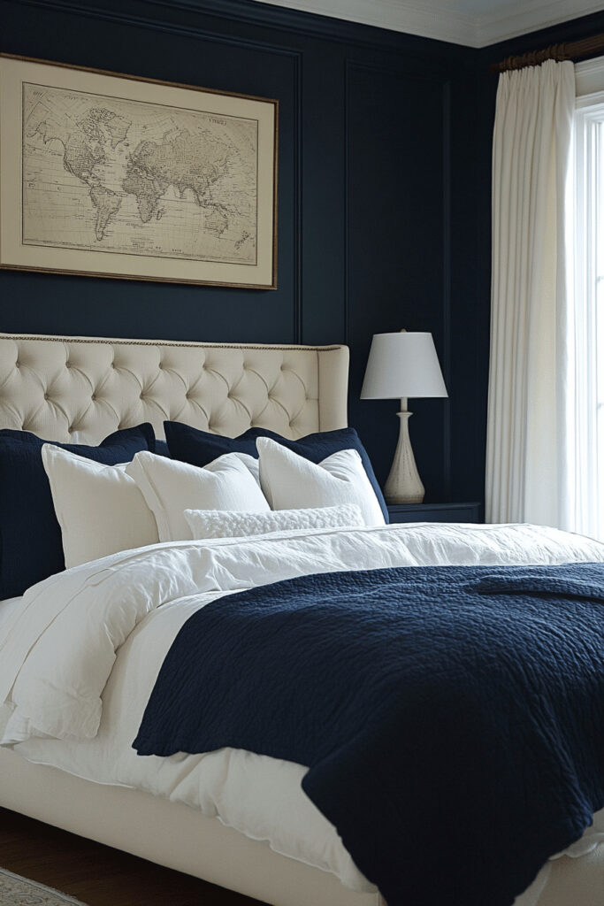 The Nautical Navy Nook exudes timeless sophistication, its navy blue walls paired with a white oak bed draped in crisp white linens, accented by silver striped pillows. Chrome fixtures add a naval touch, while a woven rug softens the floor, grounding the maritime vibe. A single navigational map keeps decor understated, fostering calm, and sheer cotton curtains filter light, amplifying brightness. A brass lamp glows softly, enhancing the classic feel. This nook suits those who love maritime elegance, offering a tropical bedroom where navy creates a cozy, refined haven.