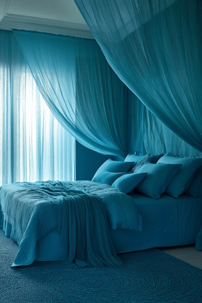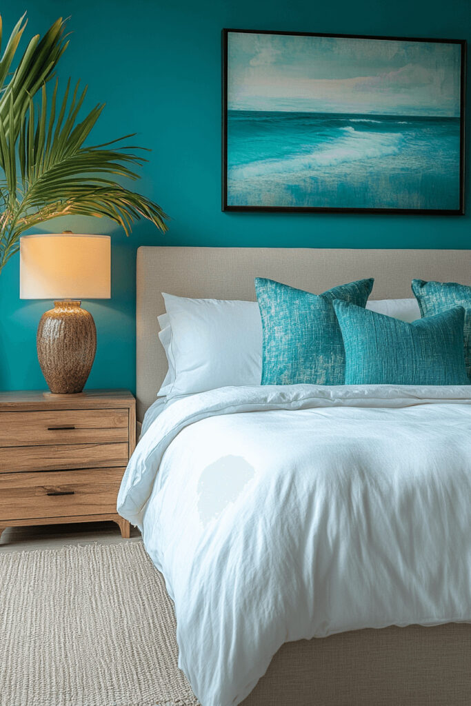 The Caribbean Blue Sanctuary bursts with vibrant calm, its deep turquoise walls paired with a whitewashed rattan bed draped in neutral linens, accented by silver coral figures. Sleek furniture balances the bold hue, while a woven rug softens the floor, grounding the marine vibe. A single abstract ocean print adds sophisticated art, fostering peace, and sheer cotton curtains filter light, amplifying the vibrant glow. A rattan chandelier glows warmly, enhancing the tropical allure. This sanctuary suits those who love colorful boho, offering a tropical bedroom where Caribbean waters inspire cozy tranquility.