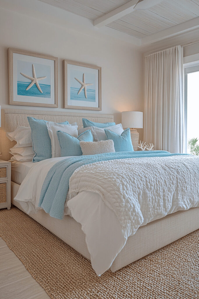 The Starfish Sand Suite radiates gentle coastal charm, its pale sand walls paired with a rattan bed draped in soft grey linens, accented by starfish-patterned pillows. Subtle seashell textures in bedding add tactile calm, while a woven rug softens the floor, grounding the beachy vibe. A single coastal vase fosters serenity, and sheer linen curtains filter light, amplifying the sandy glow. A rattan lamp glows softly, enhancing the understated feel. This suite suits those who love subtle shore themes, offering a tropical bedroom where starfish create a cozy haven.
