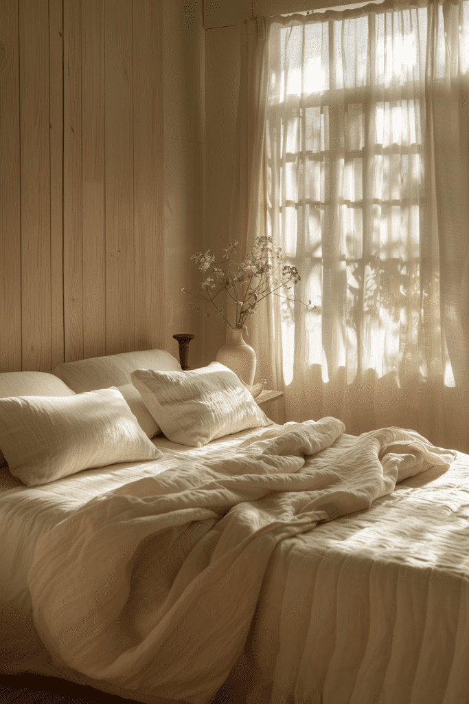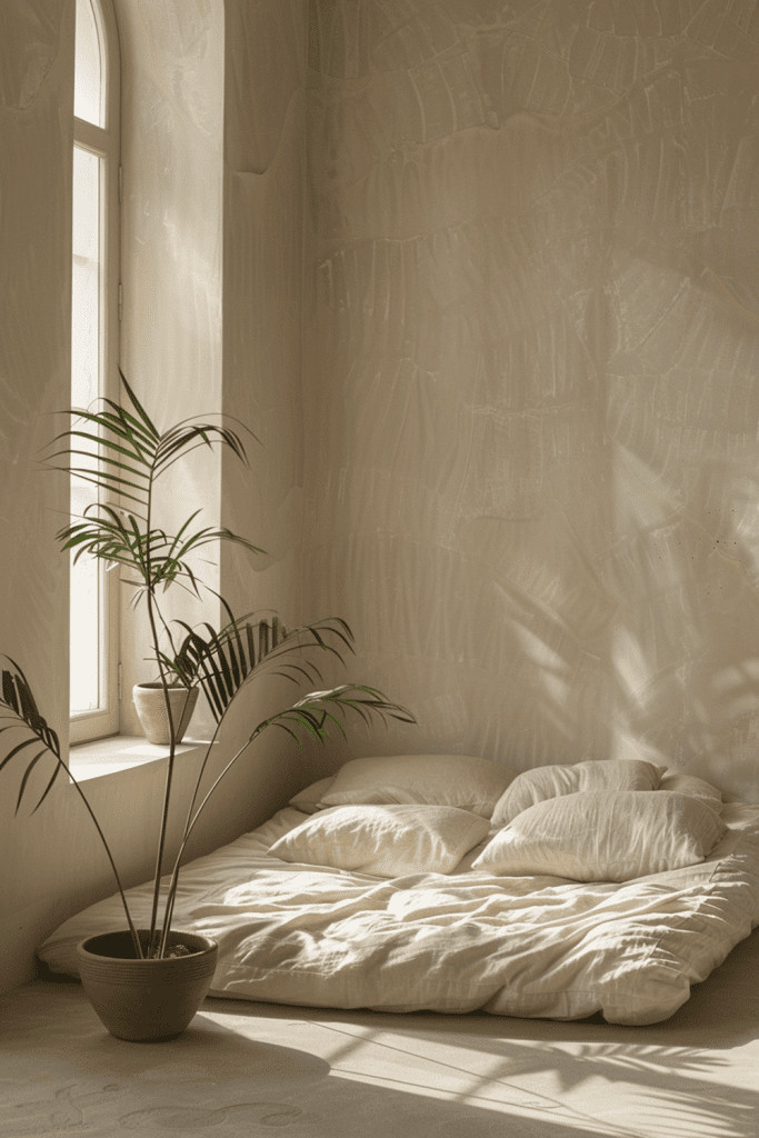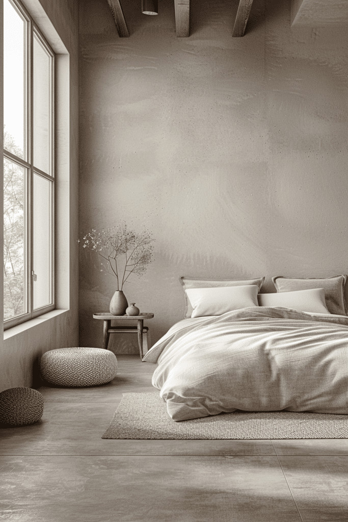 Embrace the profound beauty of minimalism by stripping your bedroom back to its essential nature. This idea focuses on unadorned walls, perhaps with a soft limewash finish that catches the light in subtle ways, a subdued and earthy color palette, and only the most necessary furnishings. A low platform bed, a simple wooden stool as a nightstand, and soft, natural textiles are all you need. This aesthetic of ‘less is more’ is the heart of Wabi Sabi, eliminating visual noise and creating a peaceful sanctuary where the mind can find clarity and rest.