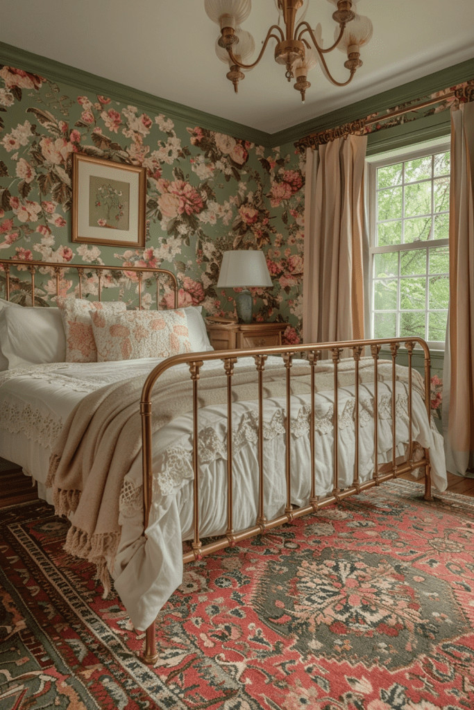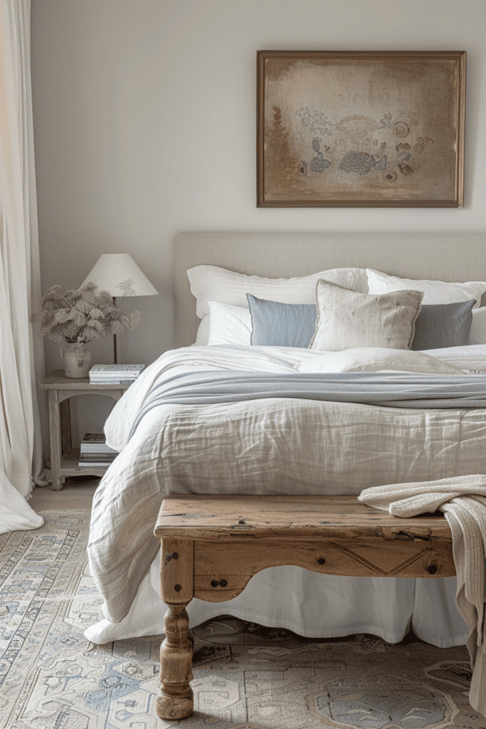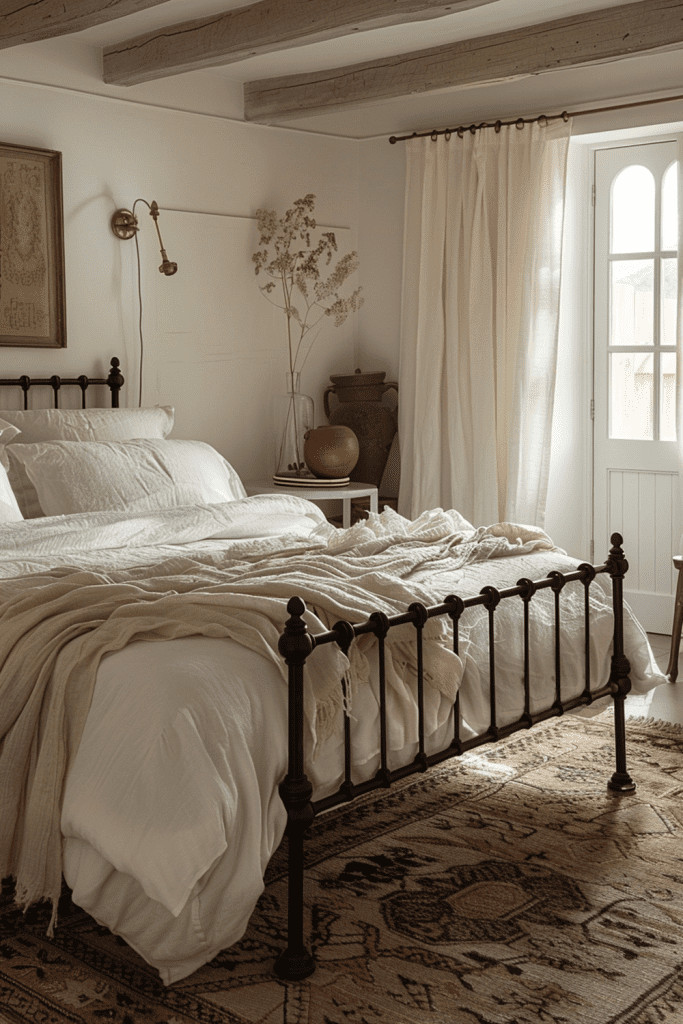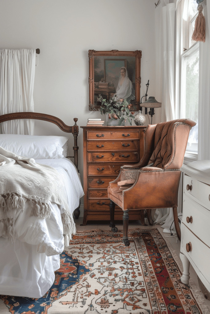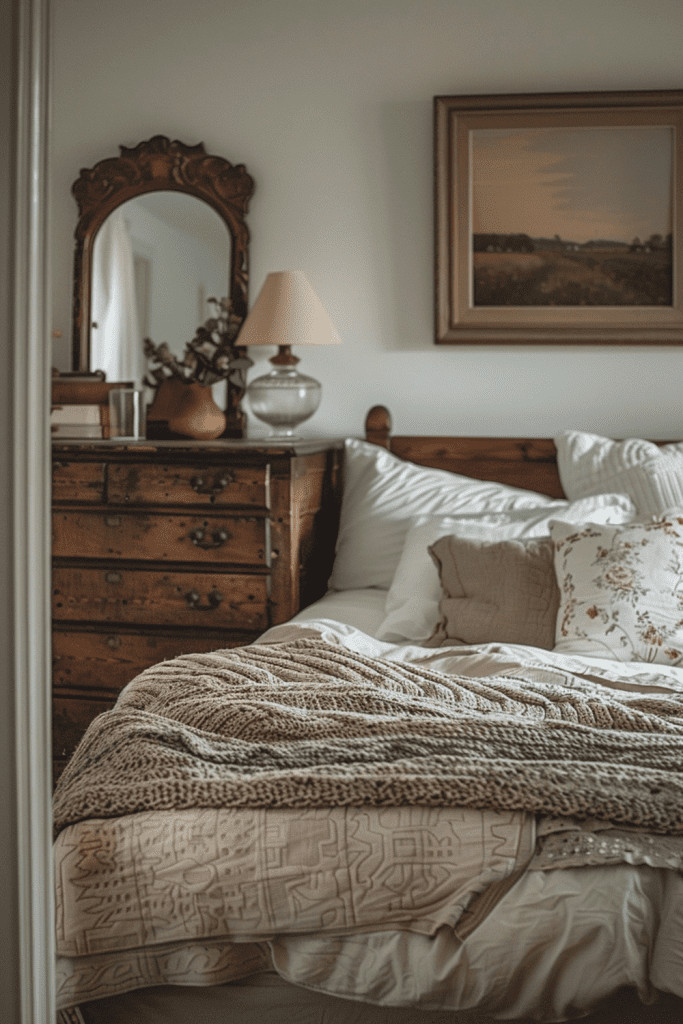 Actively celebrate the beauty of time by curating furniture and decor that proudly show their age. An aged elegance area might feature a metal vase with a rich patina, a wooden chest with faded paint, or a mirror with foxing on the glass. These signs of wear and natural decay are not flaws to be hidden but are cherished as part of the object’s unique history and journey. This bedroom appreciates the stories behind each piece, creating a space that is rich with character, soul, and a sense of continuity.
