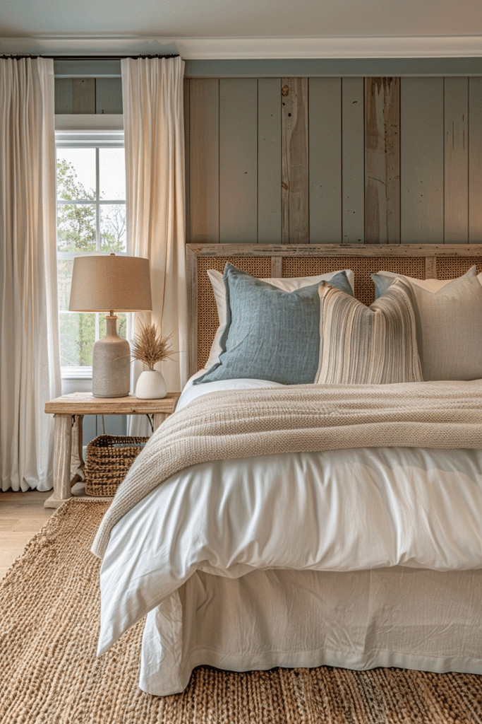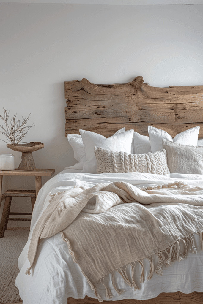 Showcase the incredible beauty of weathered wood and its natural patina. This bedroom embraces the Wabi Sabi philosophy of finding character in the old, the worn, and the imperfect. Use reclaimed barn wood for an accent wall, a piece of sun-bleached driftwood as a sculptural element, or a simple bench made from an old railway sleeper. Each knot, crack, and silvered surface tells a story of exposure to the elements, creating a space that is rich with texture, history, and rugged natural beauty.