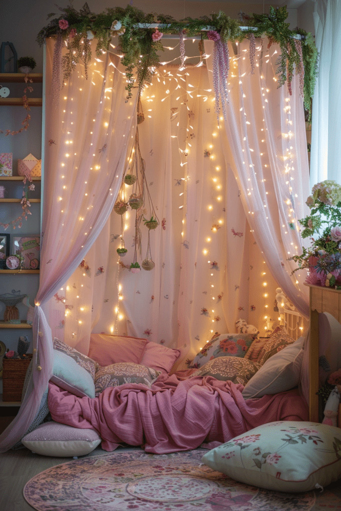 Transform your child’s bedroom into a whimsical fairy garden where magic feels real. This design uses soft pastel colors, floral garlands, and an abundance of twinkling fairy lights to create an enchanting atmosphere. A canopy of sheer, draped fabric over the bed can feel like a fairy’s bower. Add small, whimsical details like mushroom-shaped stools, butterfly wall decals, and plush pillows to create a magical space where imaginations can soar and sweet dreams are guaranteed.