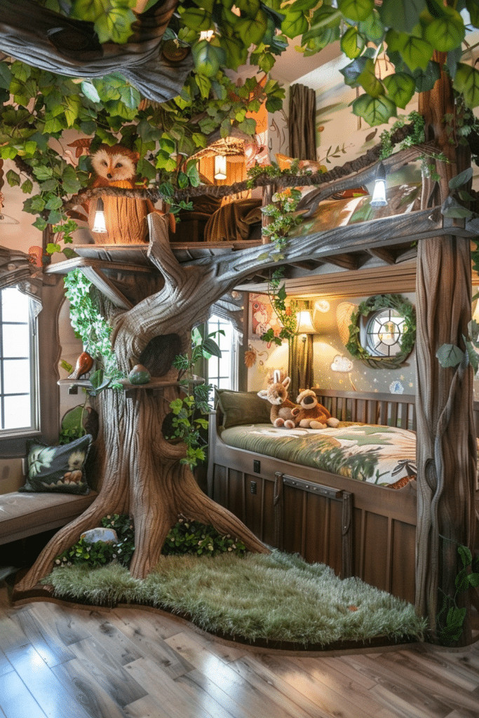 Create a magical realm where classic fairy tales come to life. An Enchanted Forest bedroom is filled with whimsical details like twinkling fairy lights, plush toys of woodland creatures, and charming mushroom stools. The decor feels like a storybook illustration, with a color palette of deep greens and earthy browns, accented with pops of magical color. It’s the perfect setting for bedtime stories filled with wonder and enchantment.