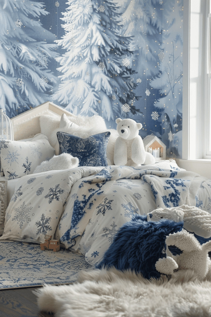 Brave the icy tundra with a cozy and cool Arctic Adventure theme. A Boho Polar Bear Paradise features arctic animal prints (like polar bears and arctic foxes), snowflake motifs, and an abundance of cozy, white faux fur accents in rugs and blankets. The color palette is crisp and cool, with whites and icy blues, creating a cozy retreat where kids can explore the frozen wilderness of their imagination.
