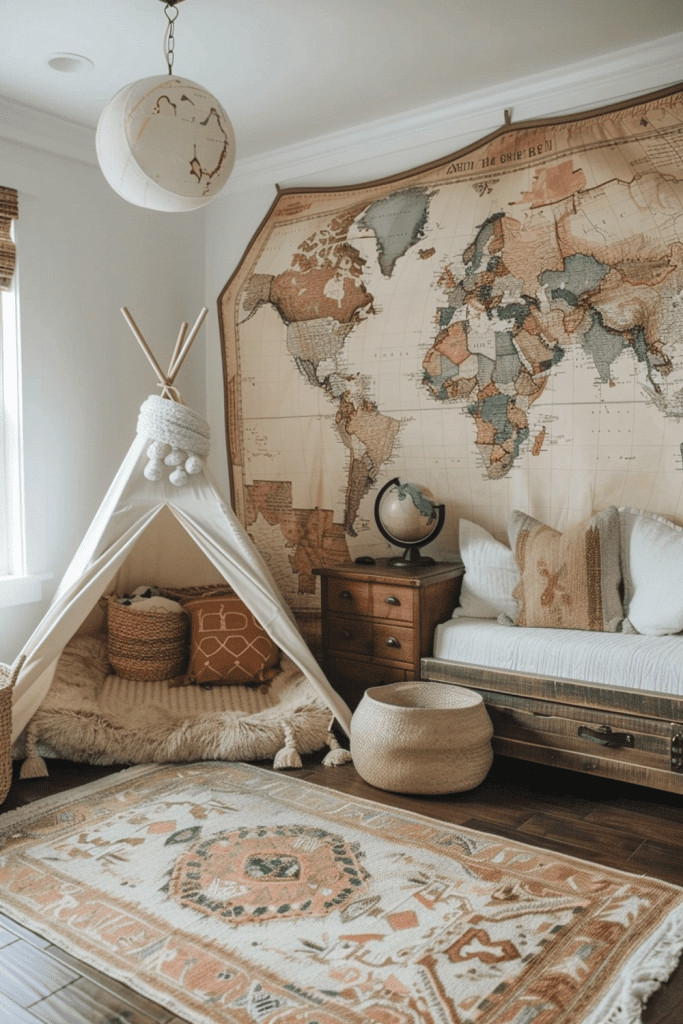 Ignite your child’s sense of adventure and curiosity with a Boho Explorer’s Haven. This theme is perfect for young adventurers, featuring vintage-style world maps on the walls, a decorative globe on a shelf, and perhaps a cozy teepee for planning expeditions. The decor can include travel-inspired elements like old suitcases for storage or textiles with tribal patterns. It’s a space that fosters a spirit of discovery and a love for the wider world.