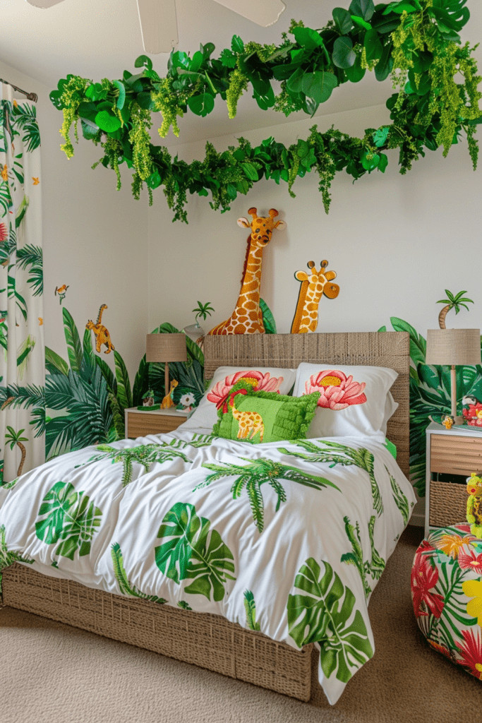 Embark on a thrilling safari adventure every day with a Boho Jungle Retreat. This theme is all about lush, tropical prints, fun safari animal accents, and plenty of greenery. Think a bold, leafy wallpaper on an accent wall, plush toys in the shape of lions, giraffes, and elephants, and a canopy that feels like sleeping under jungle leaves. It’s an exotic escape where kids can embark on imaginary journeys through lush, wild landscapes.