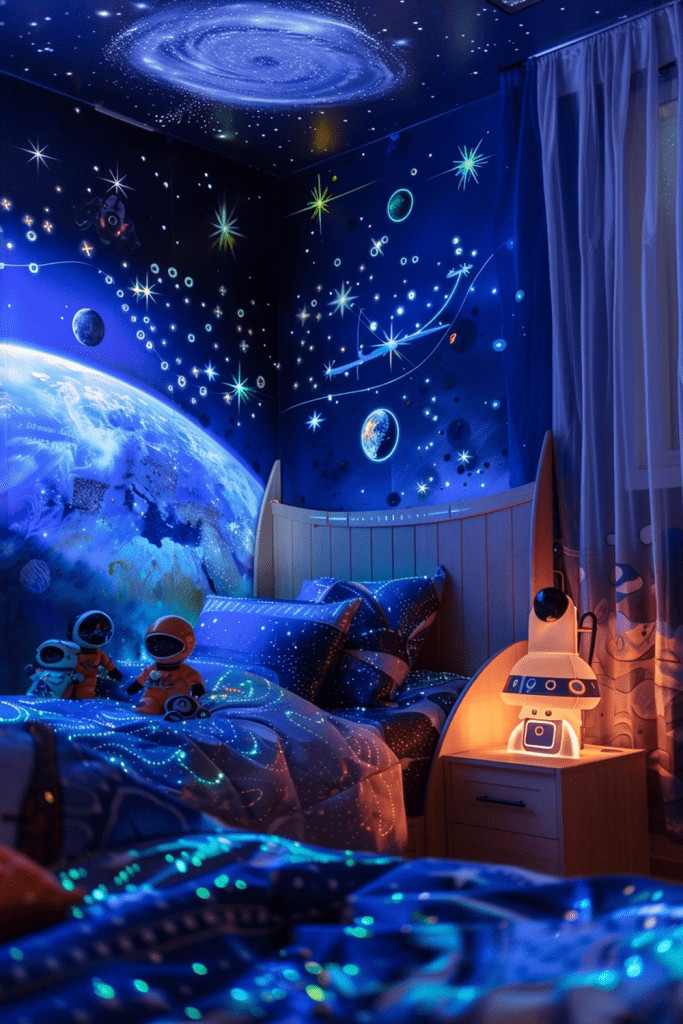 Launch your child’s imagination into outer space with a Boho Outer Space Escape. This theme features celestial wall murals of galaxies and nebulae, glow-in-the-dark stars on the ceiling, and cool, spaceship-inspired decor. The boho twist comes from using natural textures like a woven rug or wooden furniture to ground the cosmic theme, creating a space that inspires dreams of exploring the cosmos and reaching for the stars.