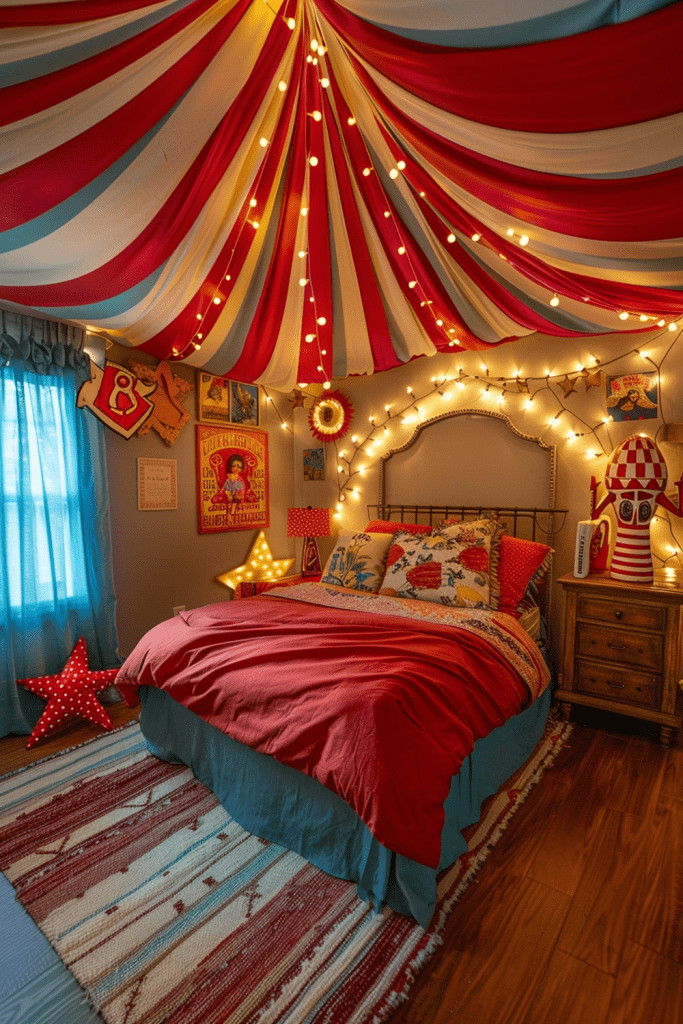 Step right up to the magic and excitement of the circus! A Bohemian Circus Big Top Extravaganza is a whimsical and fun theme. This can be achieved with a cool circus tent canopy over the bed, vintage-style circus posters on the wall, and other carnival-themed decor like star-shaped lights or a funhouse mirror. It’s a space where kids can experience the wonder of the circus every day.