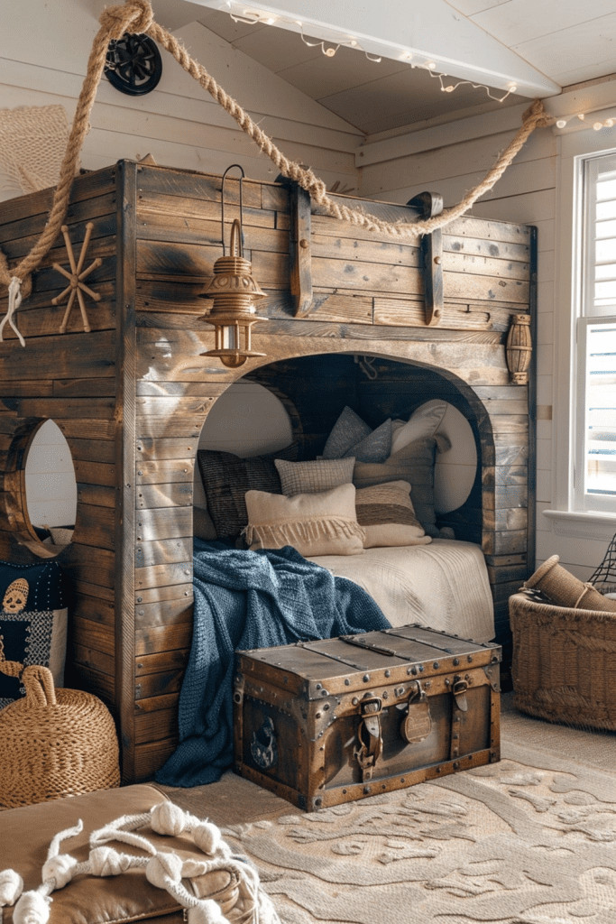 Set sail for a swashbuckling adventure with a Boho Pirate’s Treasure Island Hideaway. This fun theme can feature a cool pirate ship bed, a treasure chest that doubles as a toy trunk, and other nautical decor. The boho style comes in through the use of rustic wood, rope details, and a relaxed, adventurous vibe. It’s a sanctuary where kids can search for buried treasure and sail the seven seas.