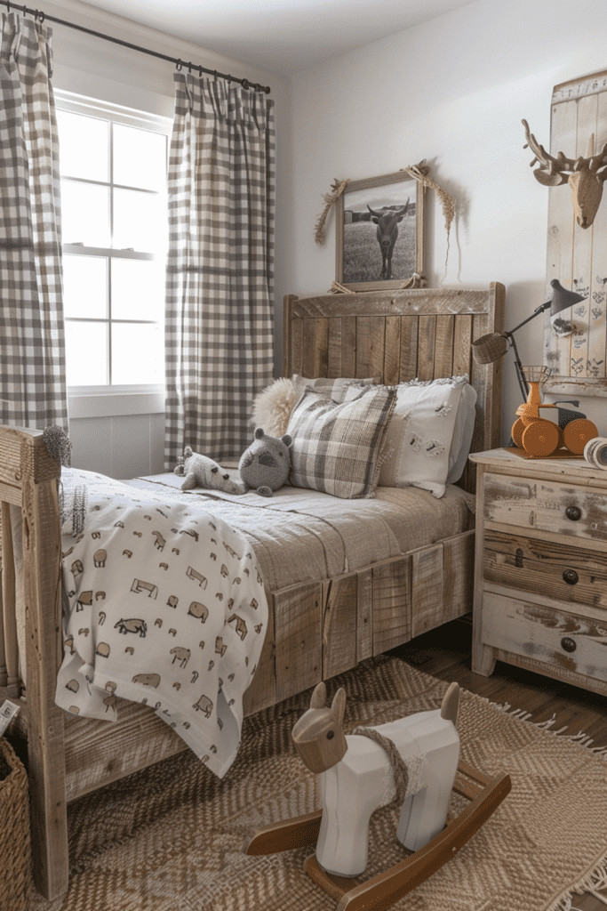 Create a charming and cozy farmhouse retreat with a Boho Barnyard theme. This design features rustic wooden furniture, fun farm animal accents (as art or plush toys), and classic gingham prints. The boho touch is added through layered textures, eclectic decor, and a relaxed, comfortable feel. It’s a space where kids can tend to their imaginary crops and play with their barnyard friends in a stylish setting.