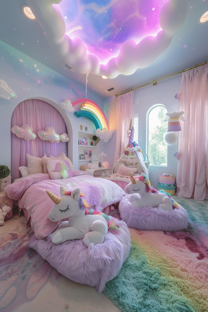 Enter a whimsical, magical world with a Unicorn Meadow Sanctuary. This theme uses a soft pastel color palette, adorable unicorn plushies, and rainbow accents to create a space where dreams of unicorns and rainbows come to life. The boho element can be seen in the use of natural textures, floral patterns, and a gentle, serene atmosphere, creating a world of pure enchantment and wonder.