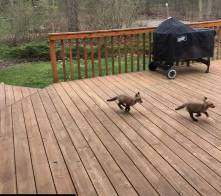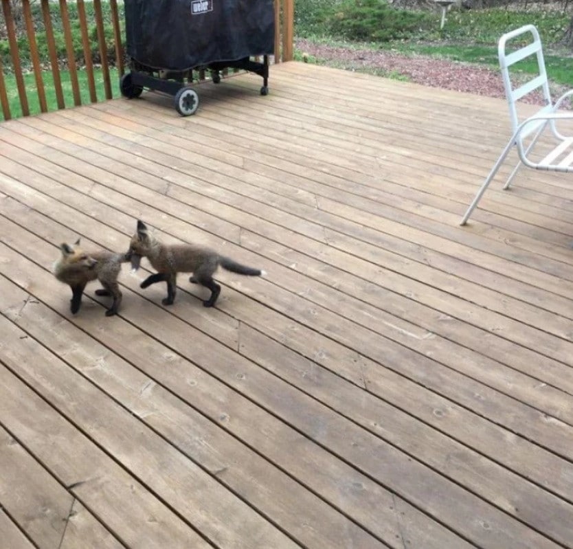 The mama fox watched over her playful kits while Grandma’s deck became a stage for these furry visitors, sharing their innocent joy with the world.
