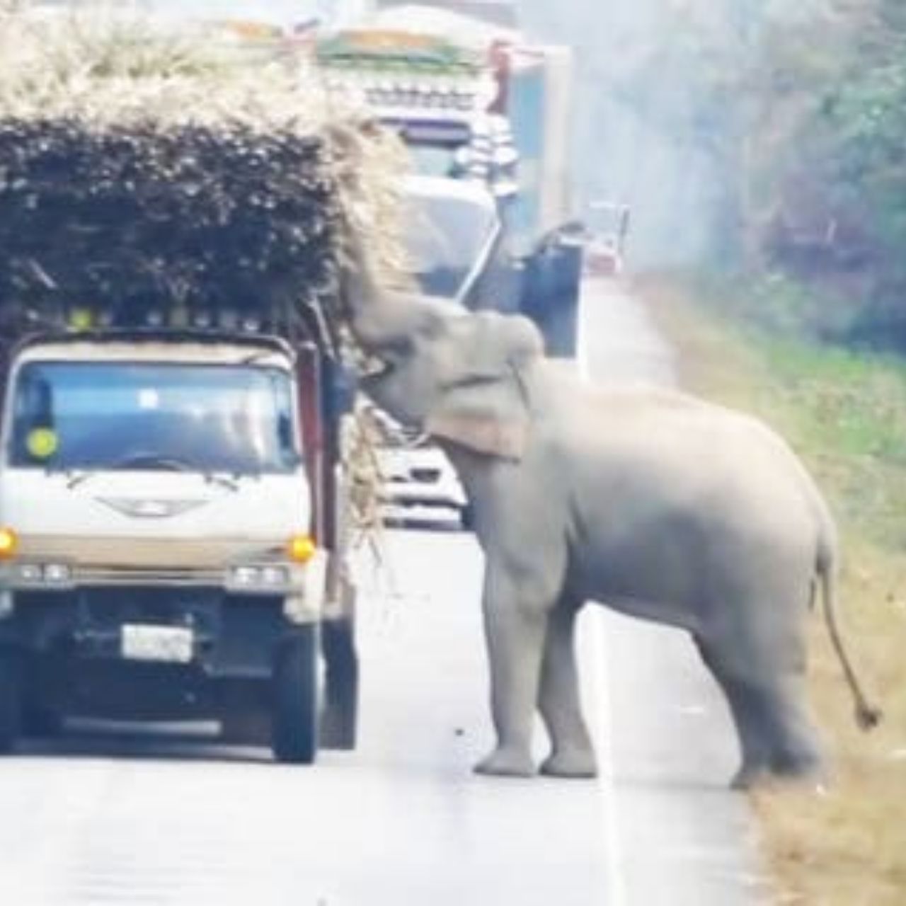Young Elephant Holds Up Traffic for Sweet Treats