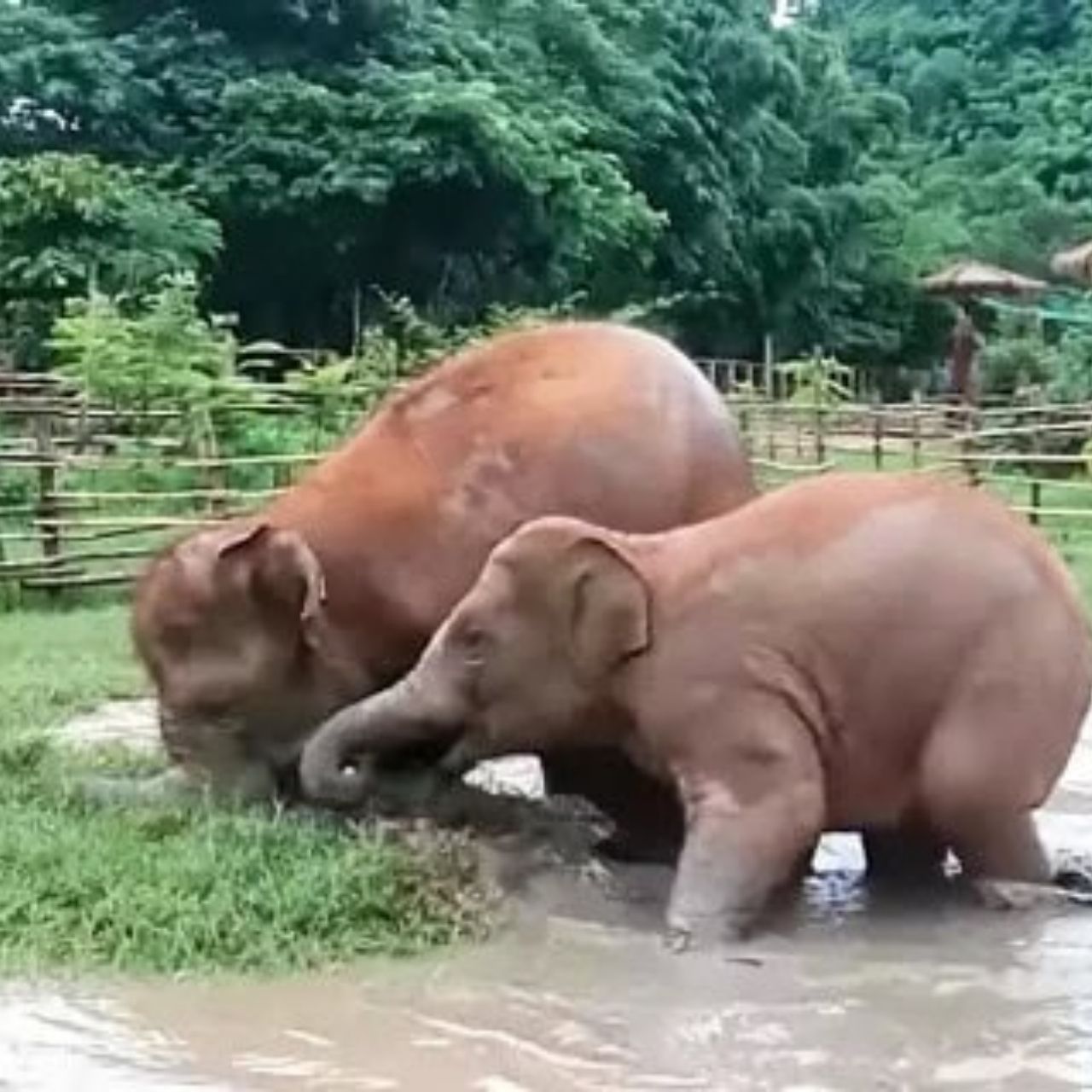 Joyful Moments at Elephant Nature Park: Two Young Elephants Play in the Mud