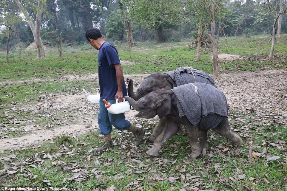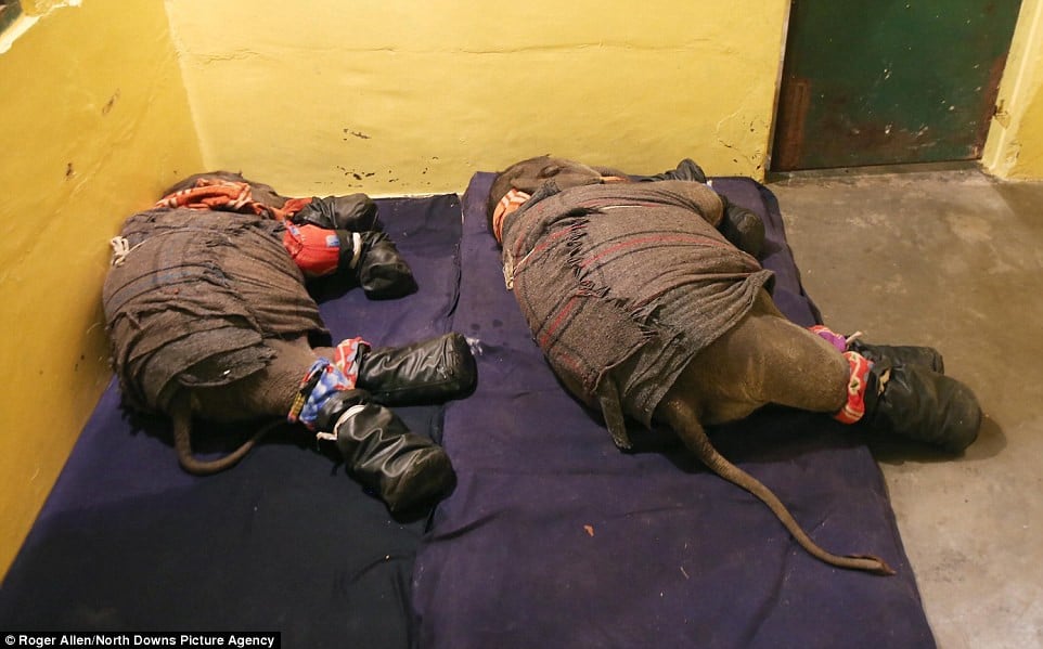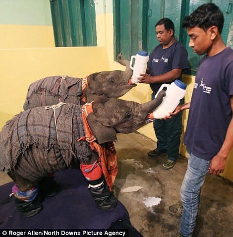 Enveloped in blankets, the two young elephants are guided to their sleeping quarters with the enticing prospect of a nightcap.