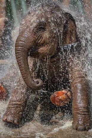 Picture a breathtaking spectacle reminiscent of a watercolor painting brought to life. The spirited and inquisitive baby elephant dances playfully amidst the refreshing spray of cascading water, its eyes gleaming with curiosity and zest.
