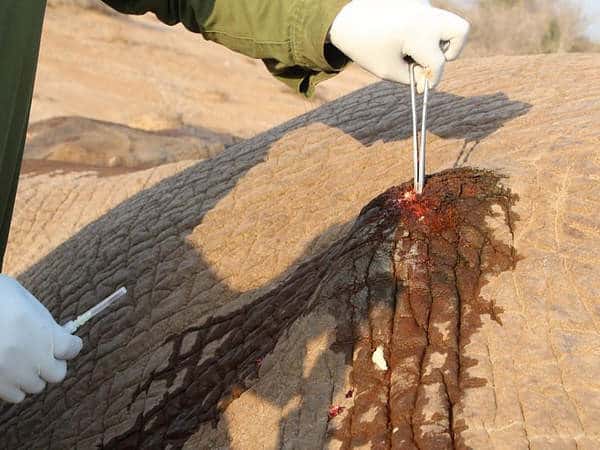 A tincture of Iodine was applied, followed by a spray of Oxytetracycline antibiotic, ensuring comprehensive treatment for the injured elephant.