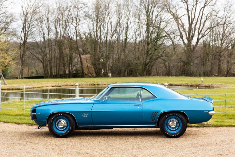 Refurbished in its original Le Mans Blue color, this Camaro retains its RS/SS ‘double option’ package specifications, including factory markings and authentic features like a boot lid spoiler and color-coded steel wheels.