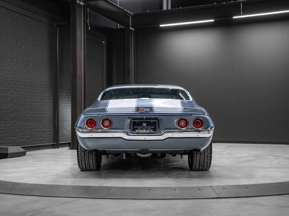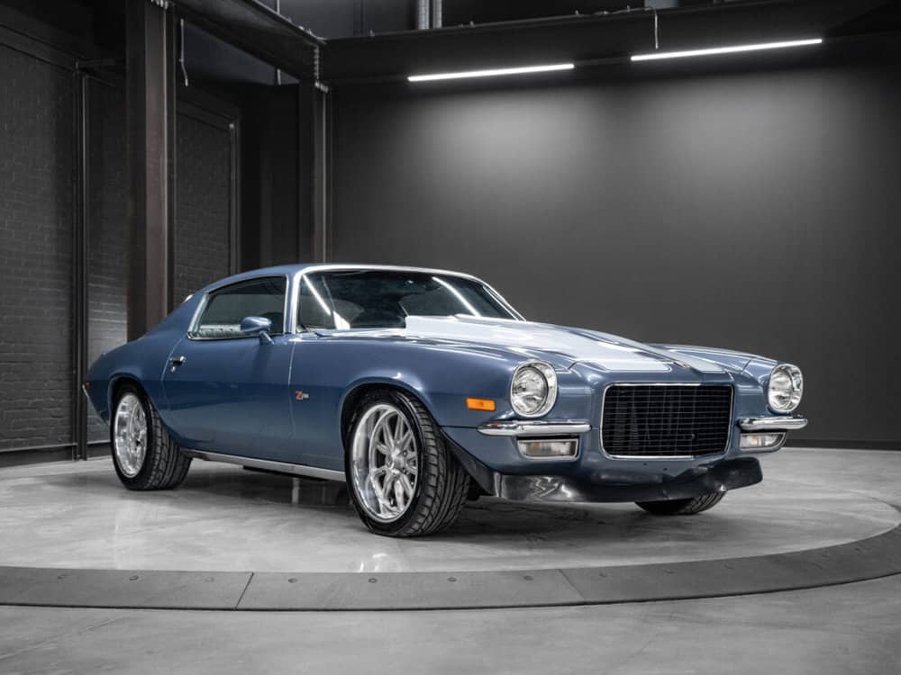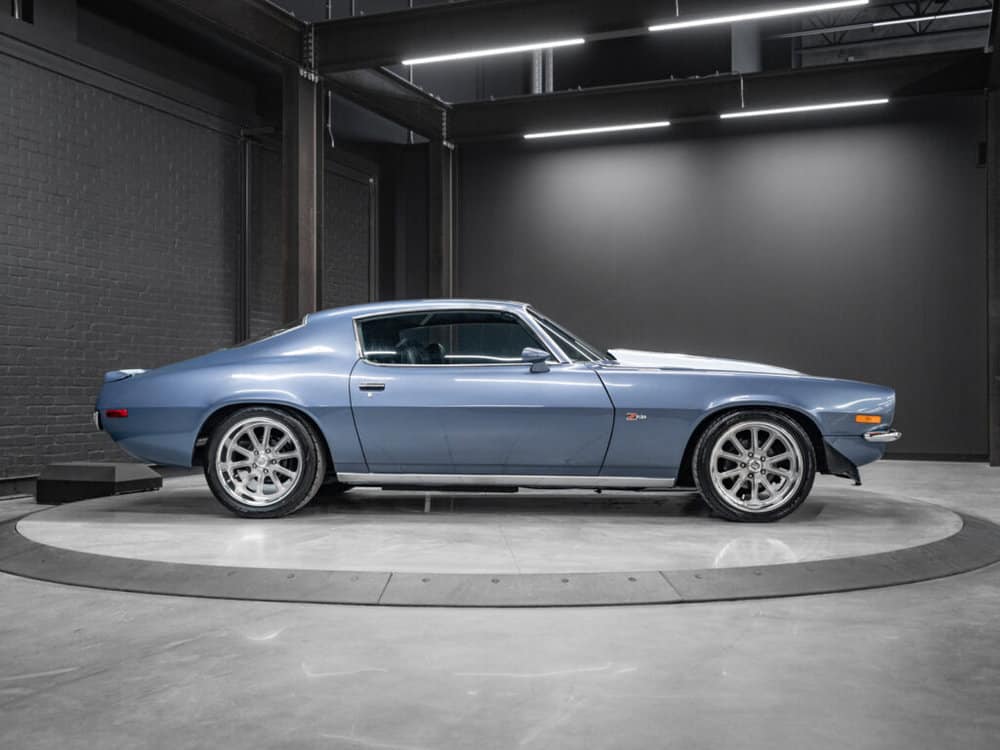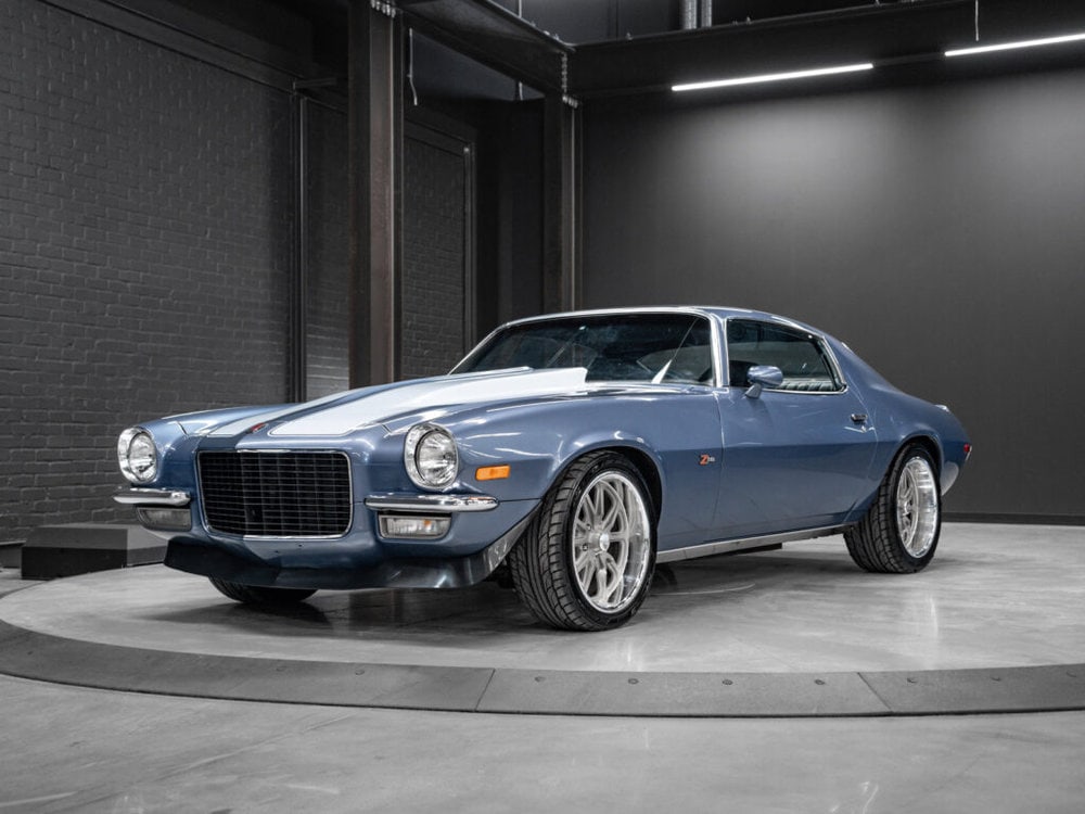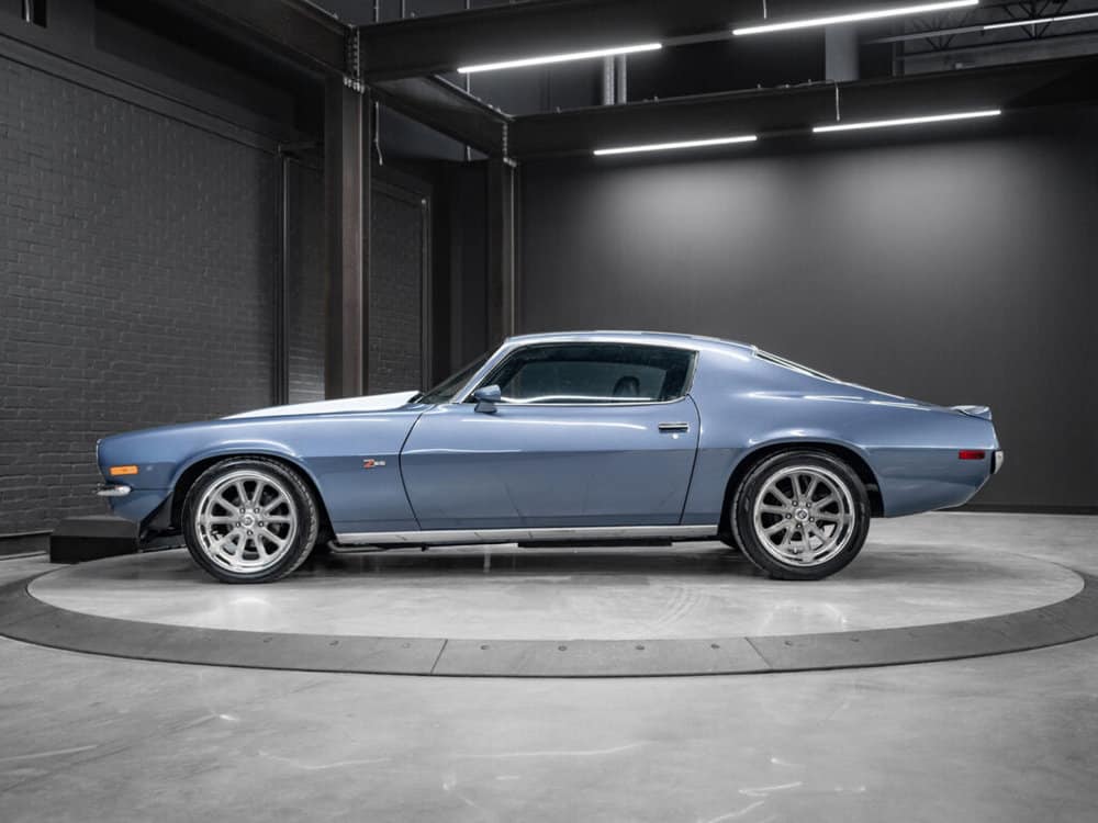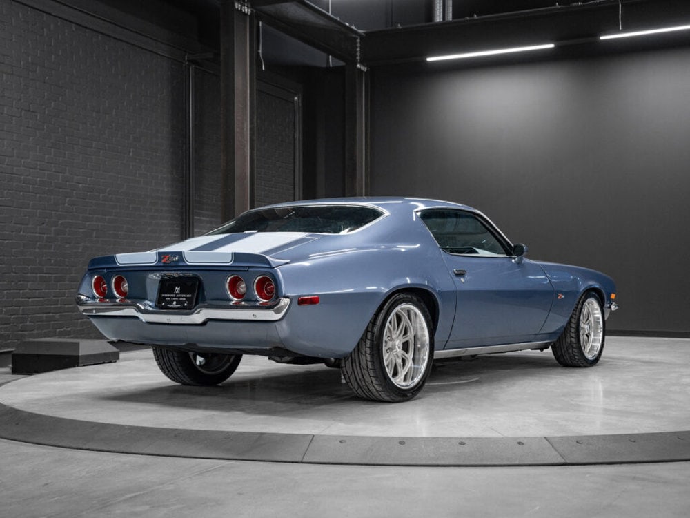 Draped in a striking blue hue, the 1971 Camaro commands attention with its sleek curves and bold design.